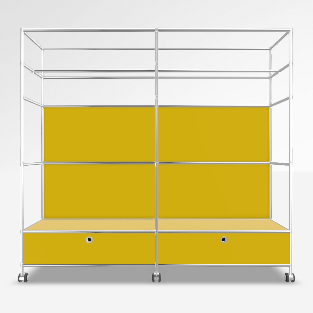 Garderobe System4 in Gelb. Mit Rollen, 2 x Schublade, 2 x Offenes Element, 2 x Offenes Element ohne Boden, 2 x Garderobe.