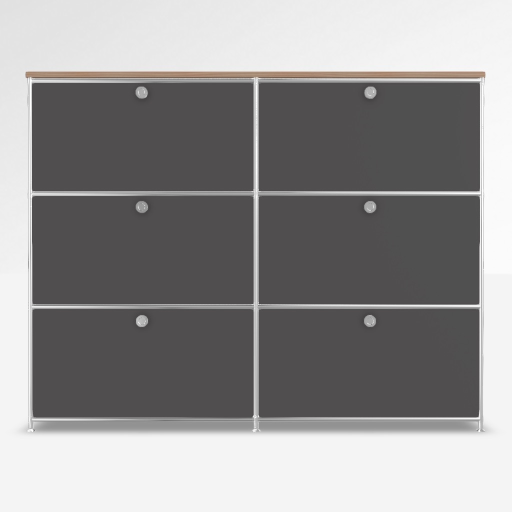 Highboard System4 in Anthrazit, mit Massivholz-Abdeckplatte in Eiche. 6 x Klappe unten.