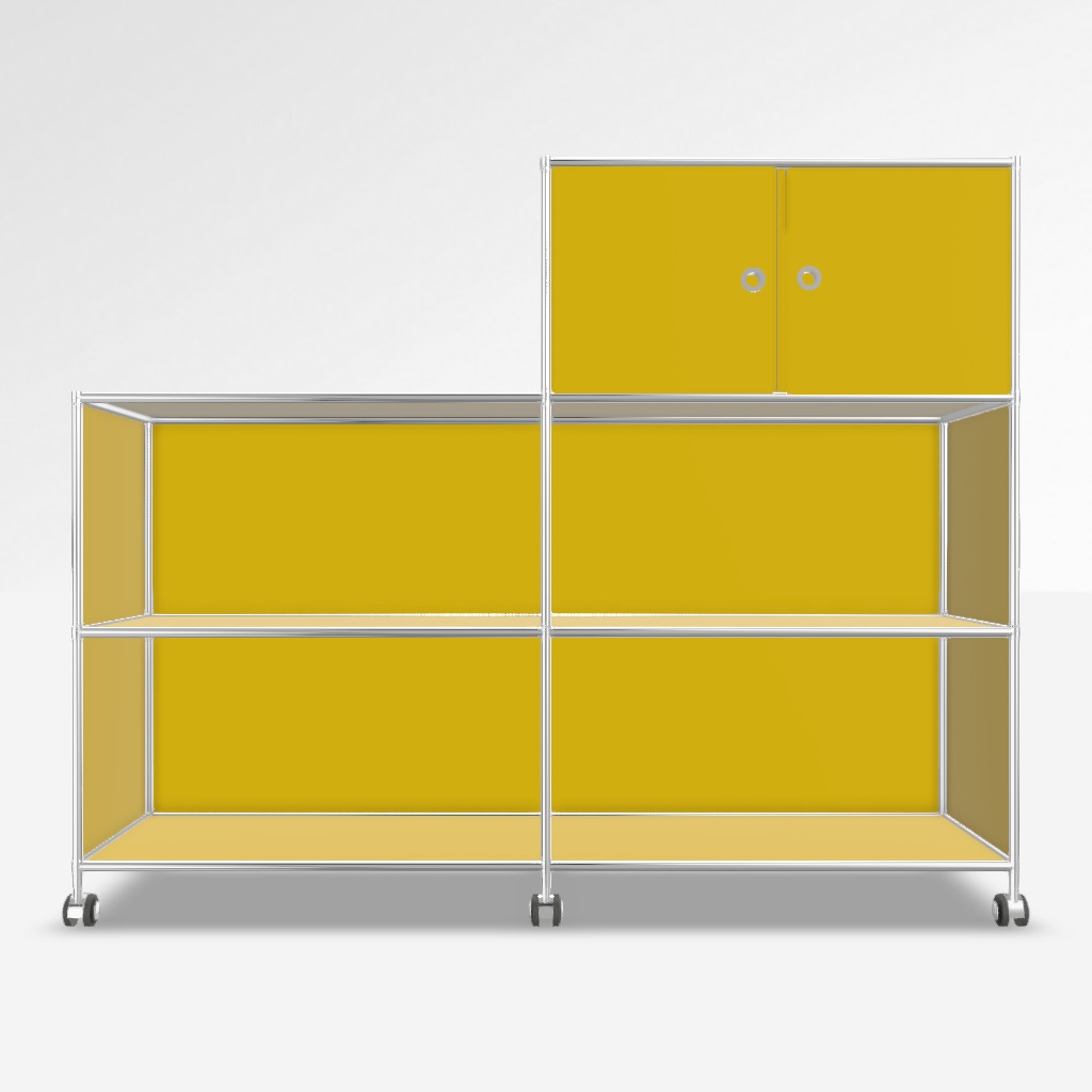 Highboard System4 in Gelb. Mit Rollen, 4 x Offenes Element, 1 x Tür.
