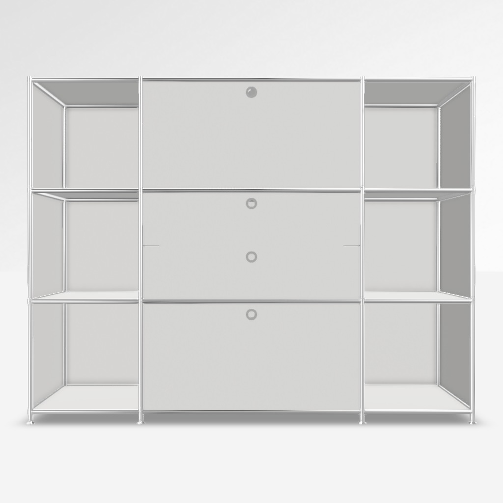Highboard System4 in Weiss. 6 x Offenes Element, 1 x Schublade, 1 x Doppelschublade, 1 x Klappe unten.