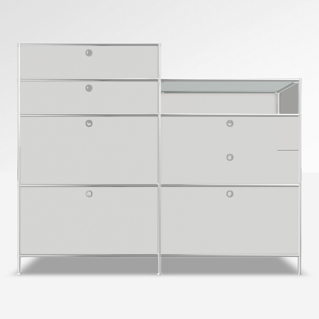 Highboard System4 in Weiss, mit Glas Satiniert. 5 x Schublade, 1 x Doppelschublade, 1 x Offenes Element.