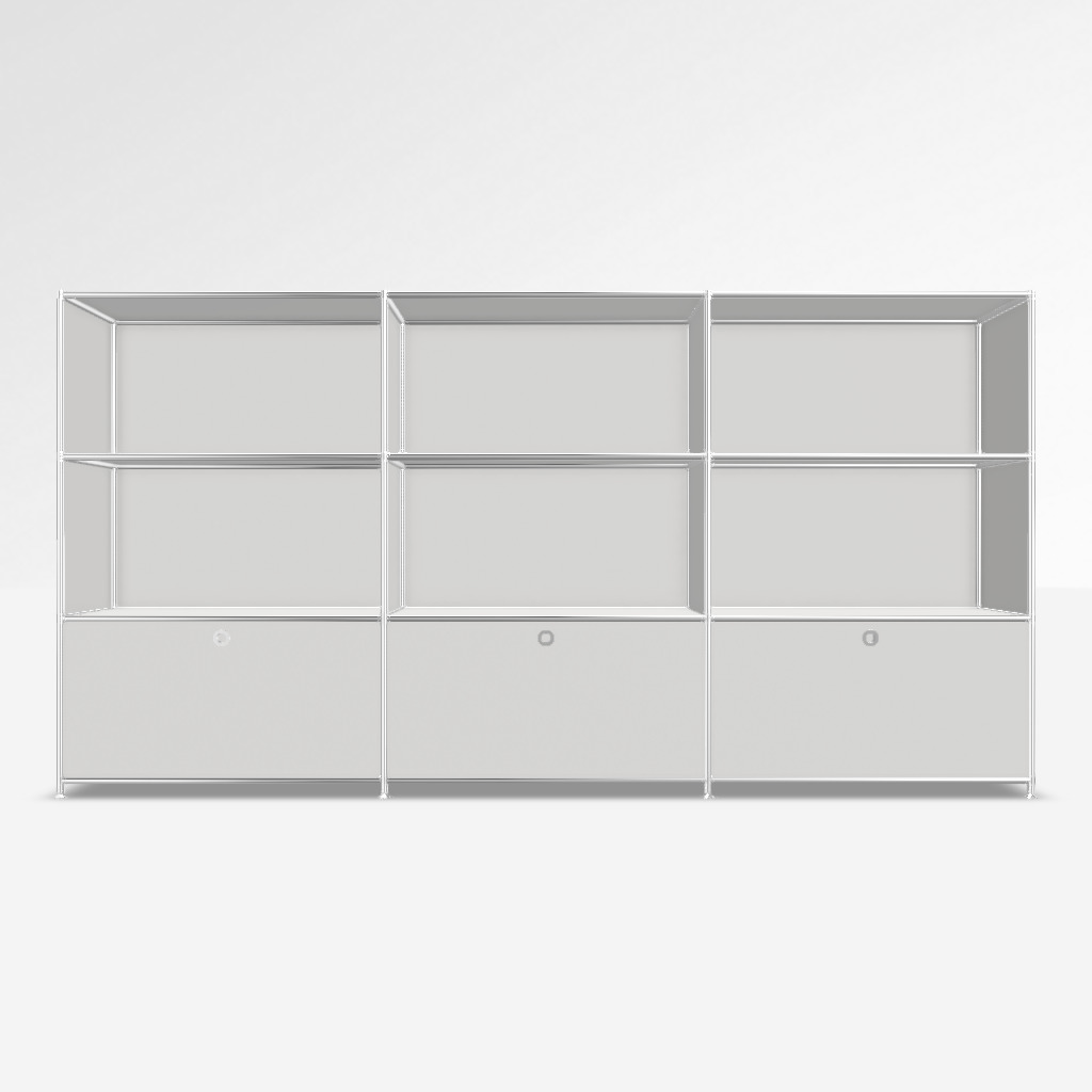 Highboard System4 in Weiss. 3 x Klappe unten, 6 x Offenes Element.