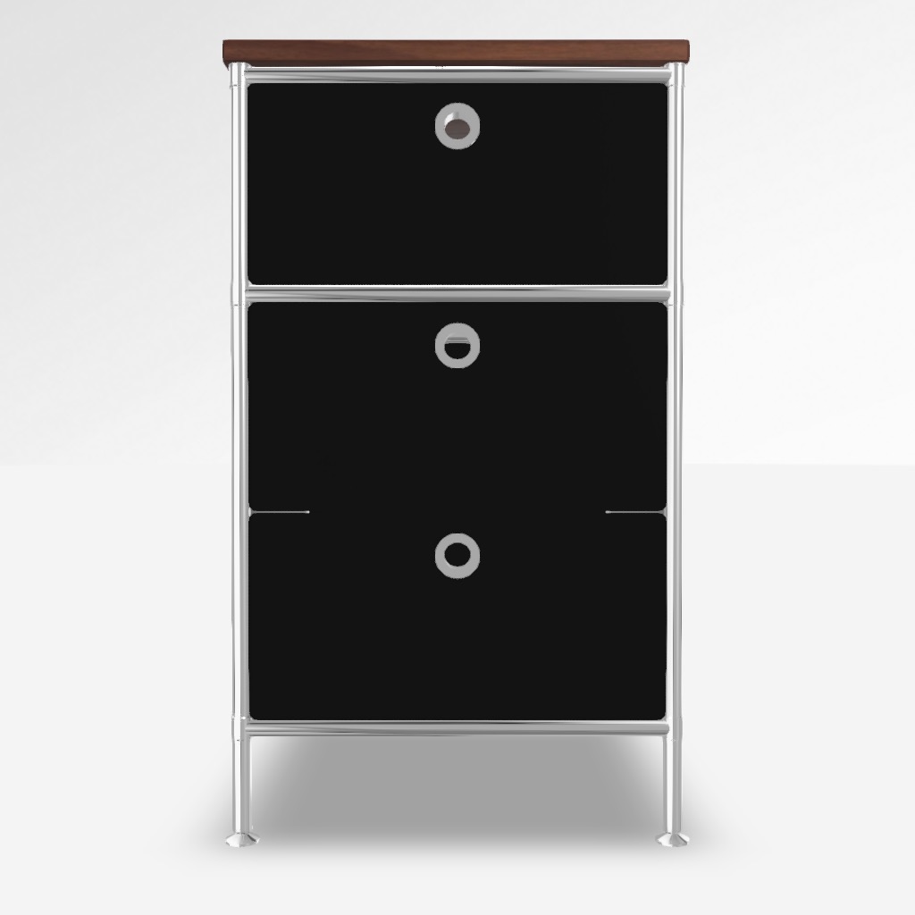 Korpus System4 in Schwarz, mit Massivholz-Abdeckplatte in Nussbaum. 1 x Doppelschublade, 1 x Schublade.