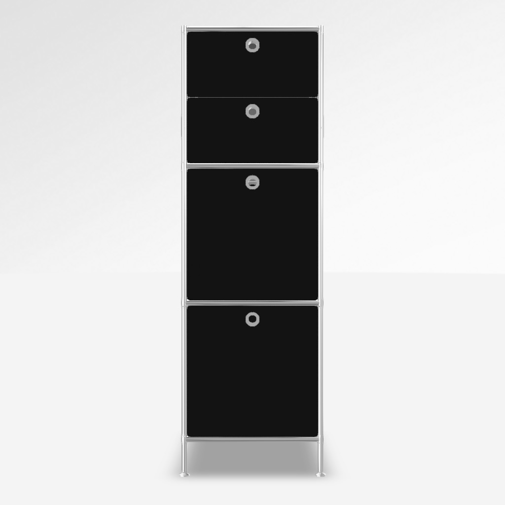 Korpus System4 in Schwarz. 2 x Klappe unten, 1 x Doppelschublade.