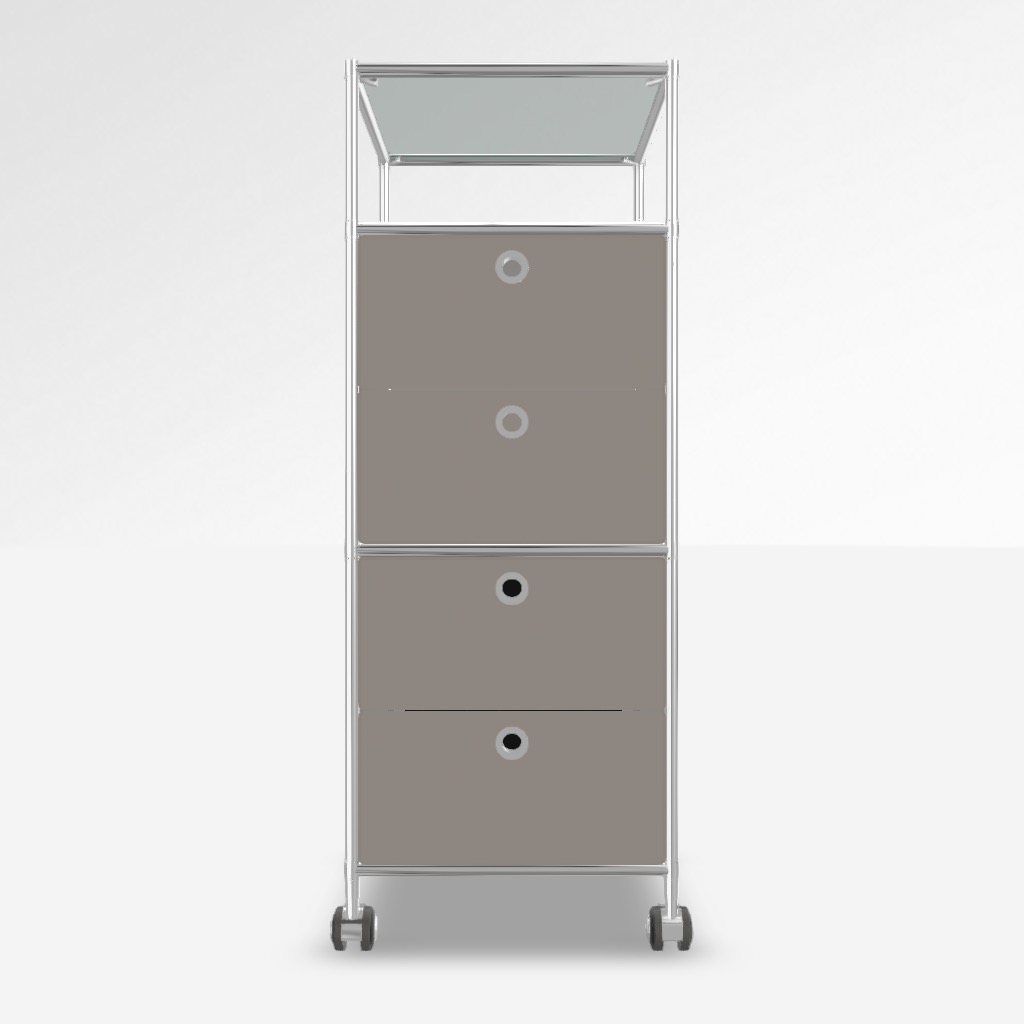 Korpus System4 in Taupe, mit Glas Satiniert. Mit Rollen, 2 x Doppelschublade, 1 x Offenes Element.