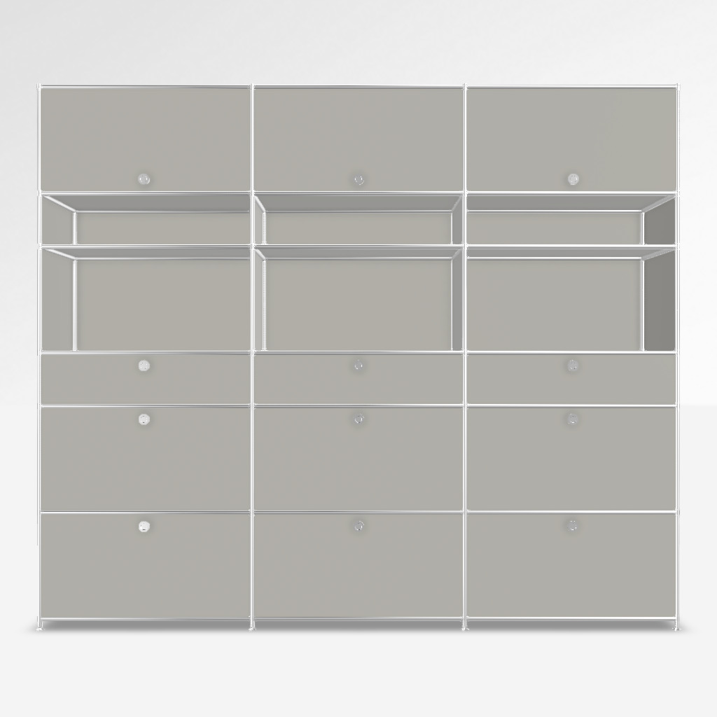 Regal System4 in Seidengrau. 6 x Schublade, 3 x Klappe unten, 6 x Offenes Element, 3 x Klappe oben.