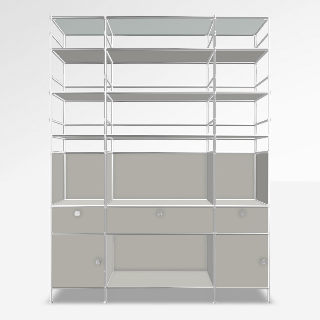 Regal System4 in Seidengrau, mit Glas Satiniert. 2 x Tür, 3 x Schublade, 13 x Offenes Element, 12 x Offenes Element ohne Boden.