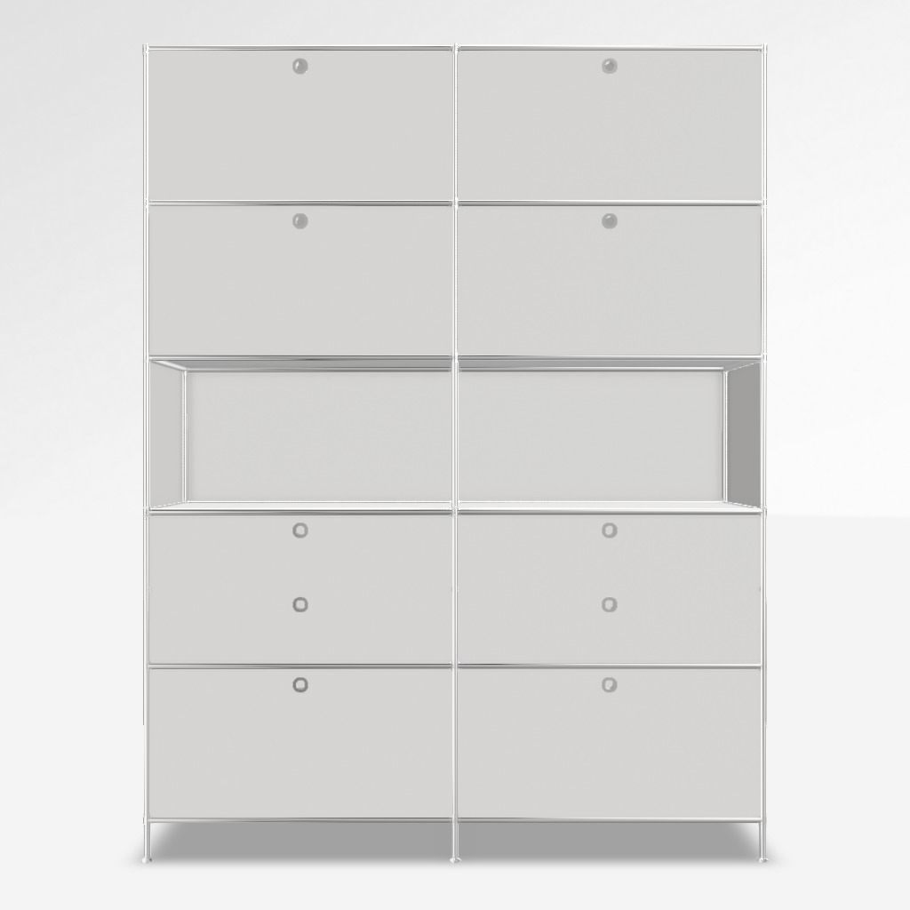 Regal System4 in Weiss. 2 x Schublade, 2 x Doppelschublade, 2 x Offenes Element, 4 x Klappe unten.