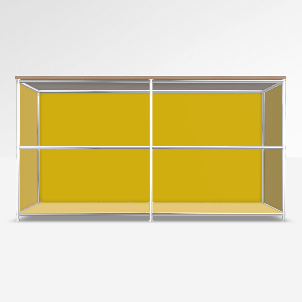 Sideboard System4 in Gelb, mit Massivholz-Abdeckplatte in Eiche. 4 x Offenes Element.