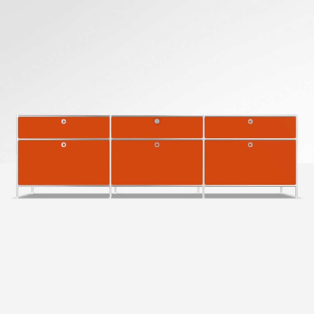 Sideboard System4 in Orange. 3 x Klappe unten, 3 x Schublade.