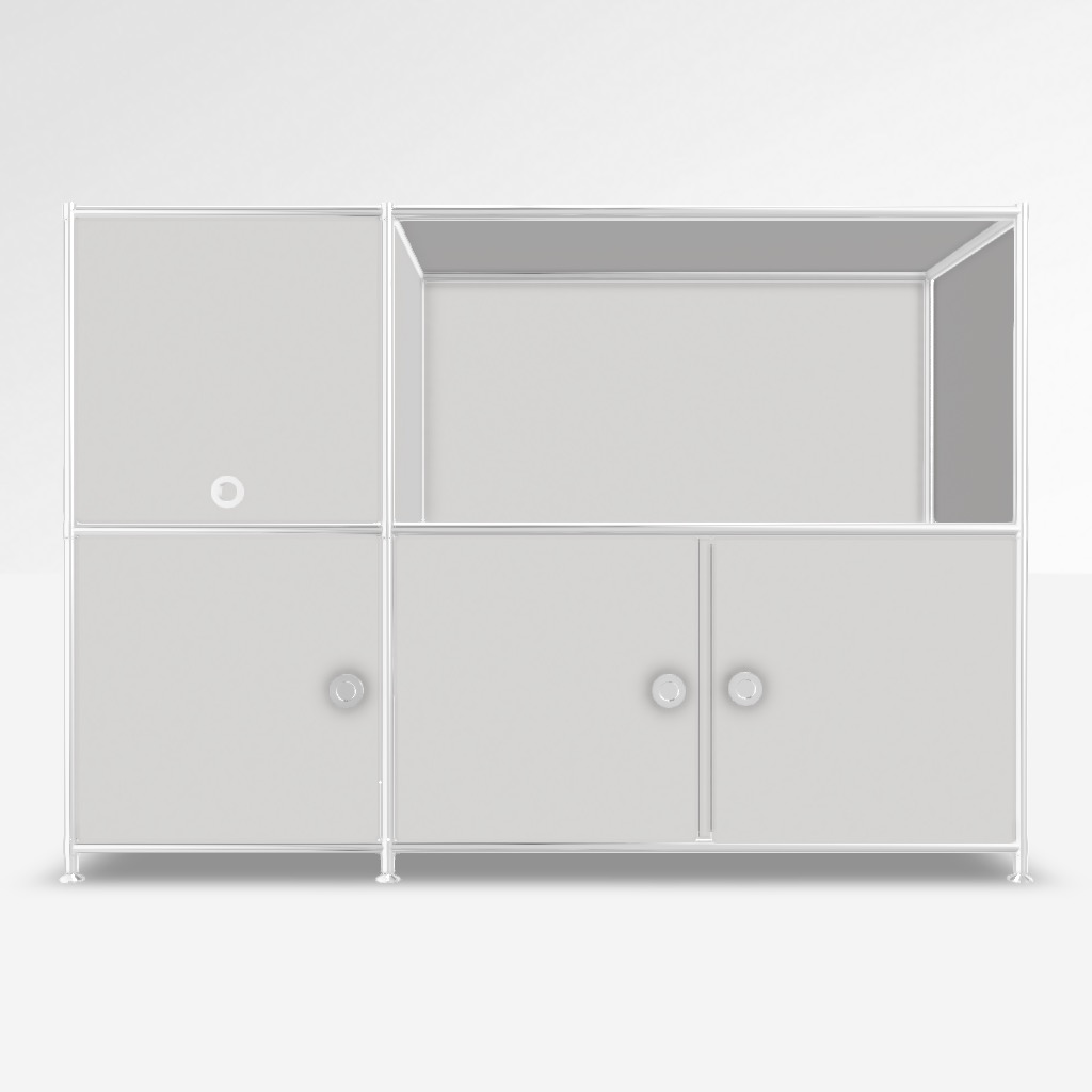 Sideboard System4 in Weiss. 2 x Tür, 1 x Klappe oben, 1 x Offenes Element.