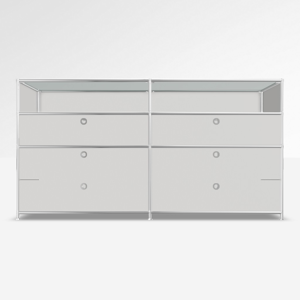 Sideboard System4 in Weiss, mit Glas Satiniert. 2 x Doppelschublade, 2 x Schublade, 2 x Offenes Element.